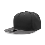 The 5 Panel Polyester Snapback is a constructed cap featuring a cotton sweatband, stitched eyelets, a retro flat bill and a plastic snap closure.