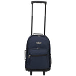 The Everest Wheeled Backpack is a compact, lightweight travel companion with smooth-rolling wheels. It features multiple zippered pockets for easy organization, a side mesh pocket for a water bottle, and double handles for convenience.