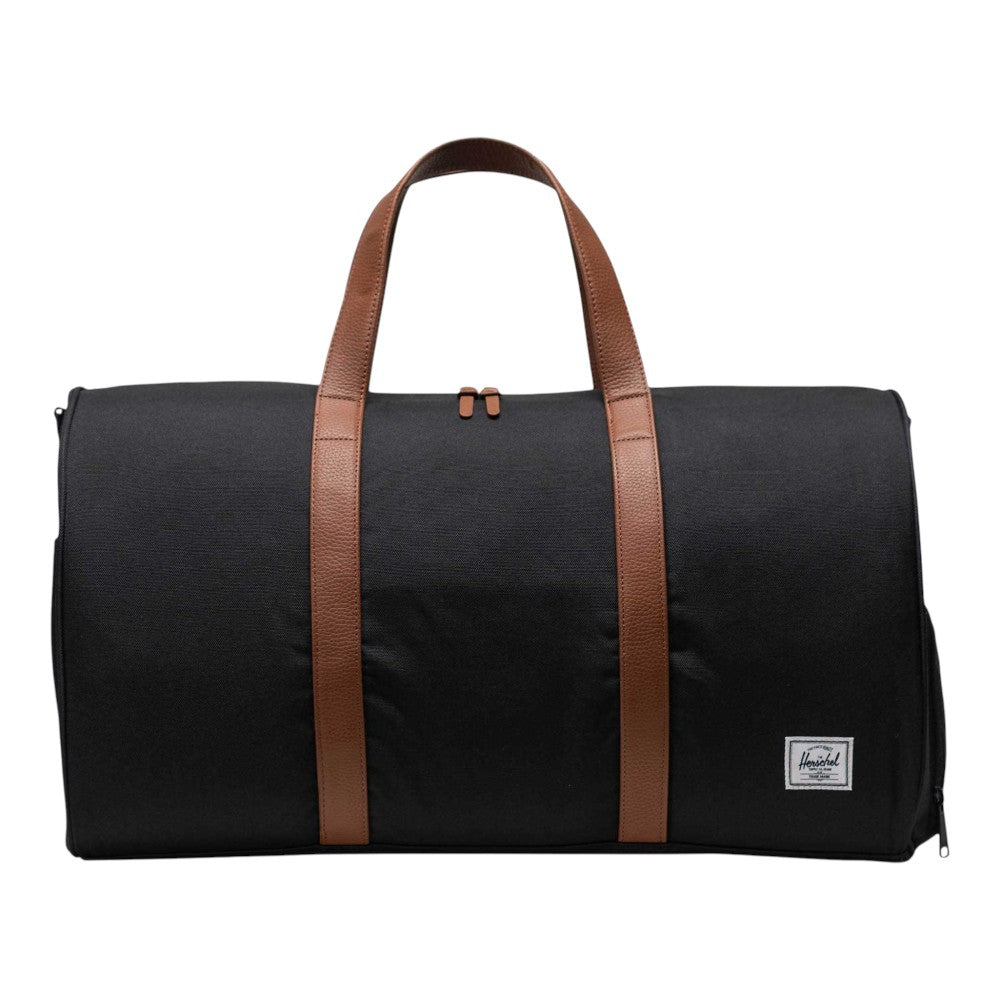 The Herschel 2009-45 Recycled Novel Duffle is the ultimate travel companion, offering clever organization and durability for your road trips. Made with 100% recycled EcoSystem™ fabrics, this duffle bag is designed with the environment in mind. It features a signature shoe compartment for your spare pair and fits perfectly in overhead bins or the trunk of your car. With waterproof zippered closures and low profile vegan leather handles, this duffle bag ensures your essentials are kept safe and secure on the go.
