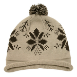 The Decky 611B - Snowflake Roll Up Beanie with Pom Pom, Knit Cap is a snug-fitting beanie featuring a snowflake pattern, rolled cuff, and two-tone pom pom.