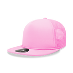 The Blank Solid Color, Flat Bill Foam Trucker Hat is a 5-panel, constructed cap with a polyester covered foam front and a mesh back. It features an integrated cotton sweatband, a flat bill and an adjustable plastic snap closure.