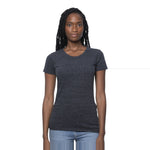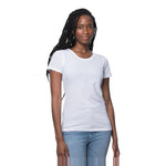 This women's short sleeve tee is made from a soft and durable blend of polyester, combed ring-spun cotton, and rayon. Featuring a crew collar, double-needle stitching on the sleeves and bottom hem, and side-seamed construction, it offers a comfortable, flattering fit. Made in the USA, this tee is perfect for casual wear and customization.