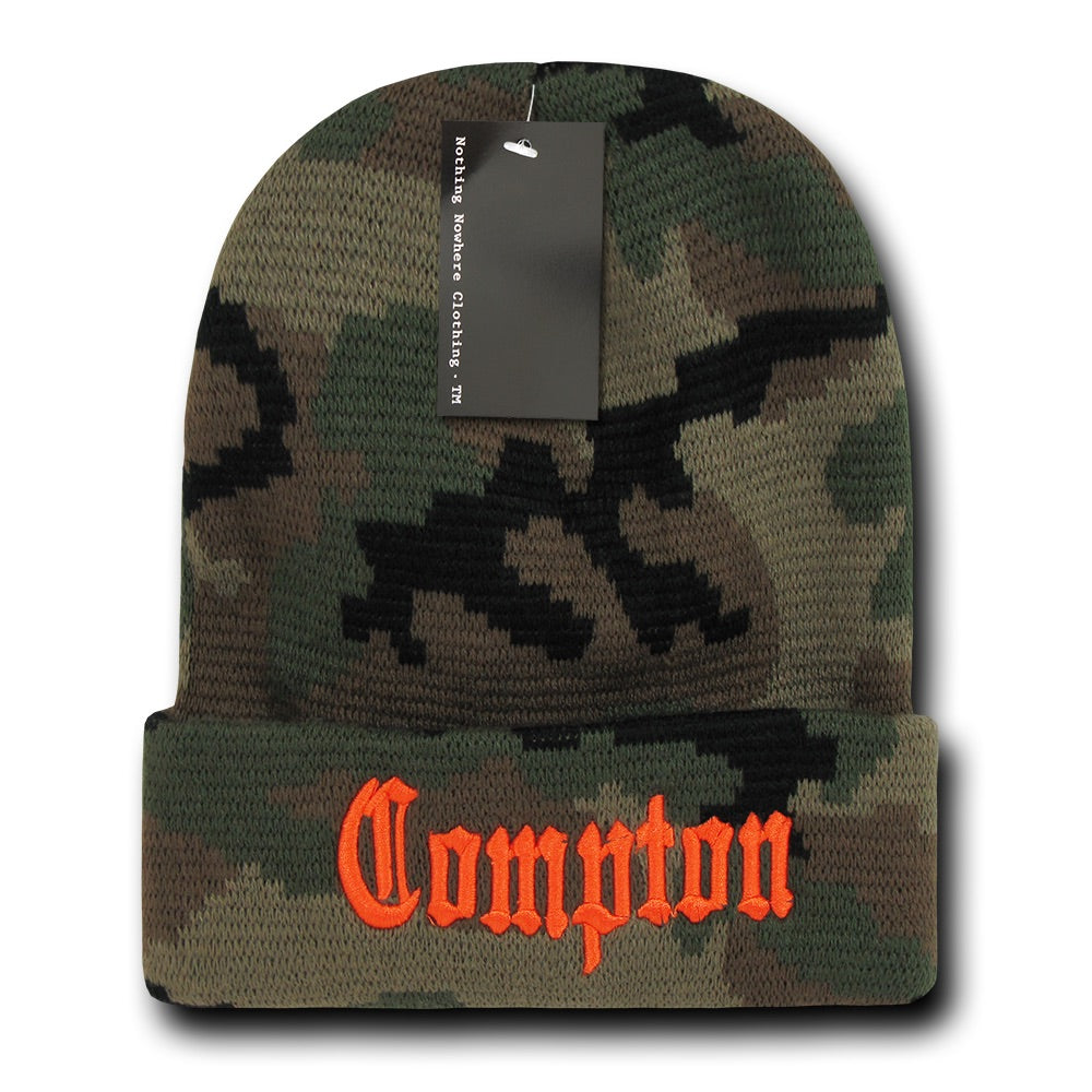 The Compton City Camo Beanie is a warm, super-soft beanie knit cap featuring high quality embroidery in old english font to represent your city. This is a long, cuffed camouflage beanie and is perfect for winter weather or everyday use.