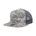 The 5 Panel Camo Trucker Hat Snapback Flat Bill Mesh Cap (Decky 1040) is a constructed camouflage cap featuring a stylish and special 5 panel design created by combining the two front panels. The cap also sports a cotton sweatband, stitched eyelets, nylon mesh rear panels, a retro flat bill and is finished with a plastic snapback closure. Available in universal (ACU) camo, desert digital camo, marines (MCU) digital camo, pink (PKD) camo, urban camo, and woodland camo.