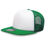 The 5 Panel Structured Foam Trucker Cap, Heavy Duty Trucker Hat, Flat Bill is a constructed hat with a thick foam crown and aerated rear panels. It has a plastic snapback closure and a retro flat bill.