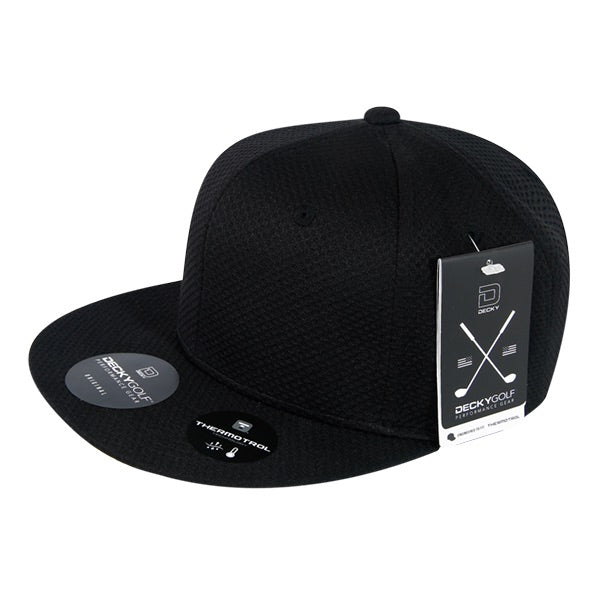The Dimple Pattern Performance Snapback Hat, Flat Bill - Golf & Sports Cap (Decky 6203) is not your traditional structured 6 panel cap. It is made with our Thermotrol Technology, which combines cool and dry properties along with UPF50 for overall protection. Cap features a ventilation eyelets, sweatband and is finished with a plastic snapback closure. This hat will be one of your many favorites!