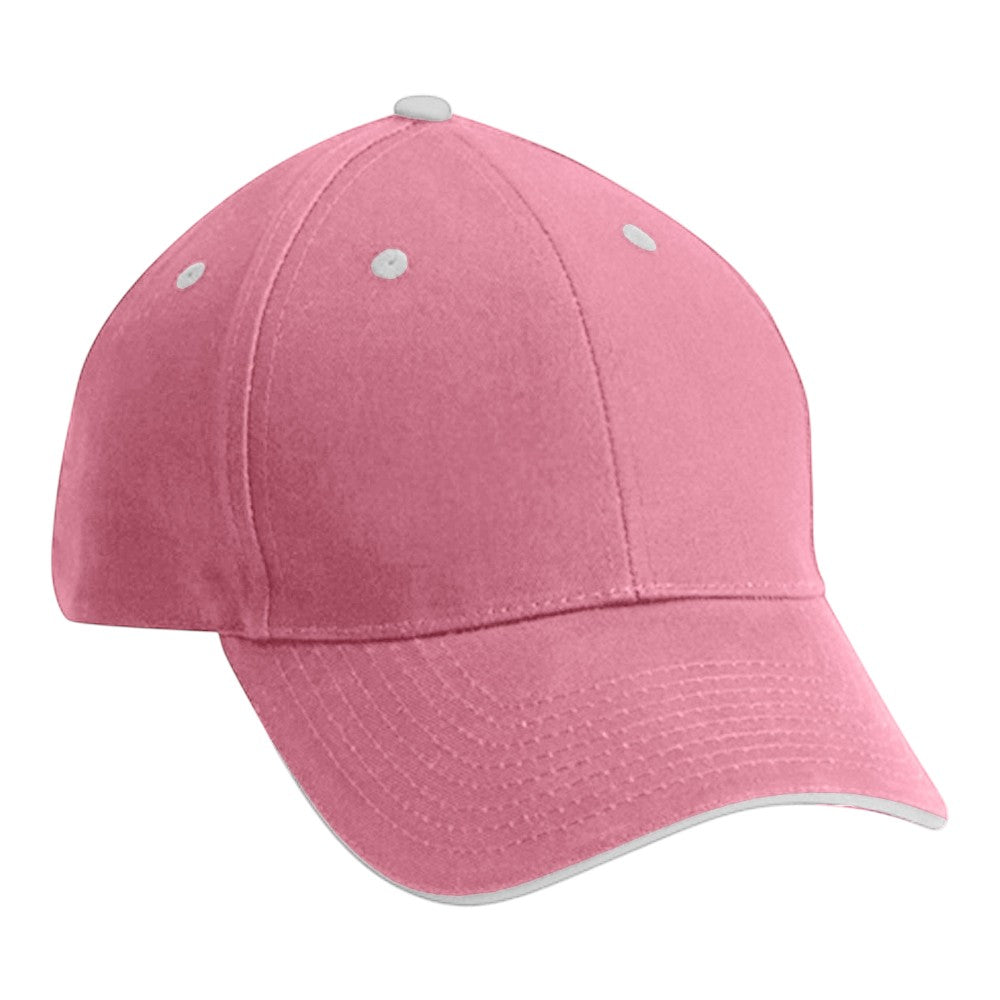 This 6-panel brushed cotton hat features a 3¼" structured crown and a clean sandwich visor for a classic, polished look. Made from soft brushed cotton twill, it offers comfortable everyday wear and a smooth surface ideal for custom embroidery. Available in Pastel Pink with your choice of **pink eyelets** or **white eyelets** for added style. Finished with a looptape closure for easy adjustability.