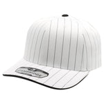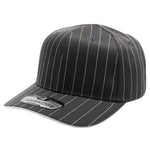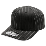 The PB327 6-Panel Pinstripe Snapback Hat in black features a crisp white pinstripe pattern and an adjustable snapback fit, making it a fine addition to any casual wardrobe.