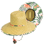 Classic straw lifeguard hat with floral and tropical print on underbrim. One Size Fits Most. Made by Goldcoast Sunwear, a Peter Grimm company.