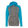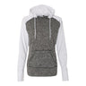 The J. America 8618 LDS CLRBLK Cosmic Hood is a sleek and modern 6 oz hoodie made from 100% spun polyester fleece fabric. It features a charcoal fleck body with solid color fleece sleeves and hood, offering a stylish contrast. The high neckline construction provides added warmth, while the thumb-hole cuffs enhance functionality and comfort.