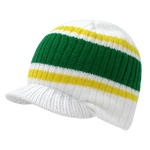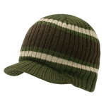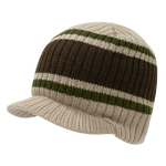 The Striped Jeep Knit Beanie Cap - Decky 620 is a soft, knitted beanie cap and features stylish, three-tone coloring and a pre-curved visor.