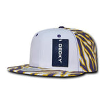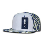 The Zebra/Tiger White Front Flat Bill Snapback Hat - Decky 1061 or Ziger White Front Snapback is a 6-panel constructed cap which features a unique two-tone striped "Ziger" print design. This stylish cap has a comfortable sweatband, stitched eyelets, a retro flat bill and is finished with an adjustable plastic snapback closure.
