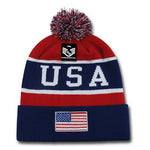 Show your patriotic spirit with the USA America Flag Knit Beanie (R93). This knit cap is a long beanie featuring a embroidery flag on the cuff and USA on the middle of the beanie with a big fuzzy ball atop. This red, white and blue beanie will give you a Fresh and Cool look. This soft beanie hat is great for the winter or everyday wear. Features a form fitting design and is made from 100% Acrylic material.