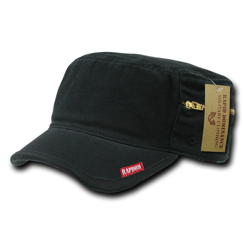 The GI Cap BDU Fatigue Hat Zipper Military Patrol Cap (Rapid Dominance R05) is a military inspired BDU patrol cap made of washed cotton and features an adjustable hook and loop closure. Comes with a zippered compartment on the left side of the hat and red stitching on the right side. This Military fatigue cap is available in Black, Khaki, Olive, Universal Digital, Woodland Digital, and Woodland Camo. Suitable for Military surplus stores and Military clothing shops.