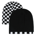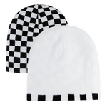 The Checker Knit Beanie (Decky 8024) is a short, snug-fitting, double-sided beanie. It features a solid color and checkered trim on one side and a fully checkered pattern on the other.