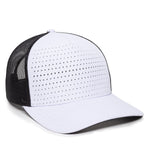 The OC502M is an innovative new cap featuring a laser perforated front panel that reveal a contrasting color that matches the undervisor. This 5-panel cap has a slight pre-curved visor with our most modern profile, the Pro Round Crown, popularized in our OC771 series. A soft snap closure, mesh back panels, and Q3® wicking sweatband make this the ideal companion for any outdoor activity.