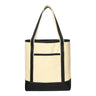 Perfect for the beach, shopping, or events, this durable tote features open tops and classic contrast handles and bottoms. Crafted from 15.5-ounce, 100% cotton canvas, it offers both style and strength, with reinforced webbing handles for durability. The exterior front pocket and interior hanging pocket with hook and loop closure provide additional convenience and organization.