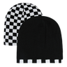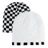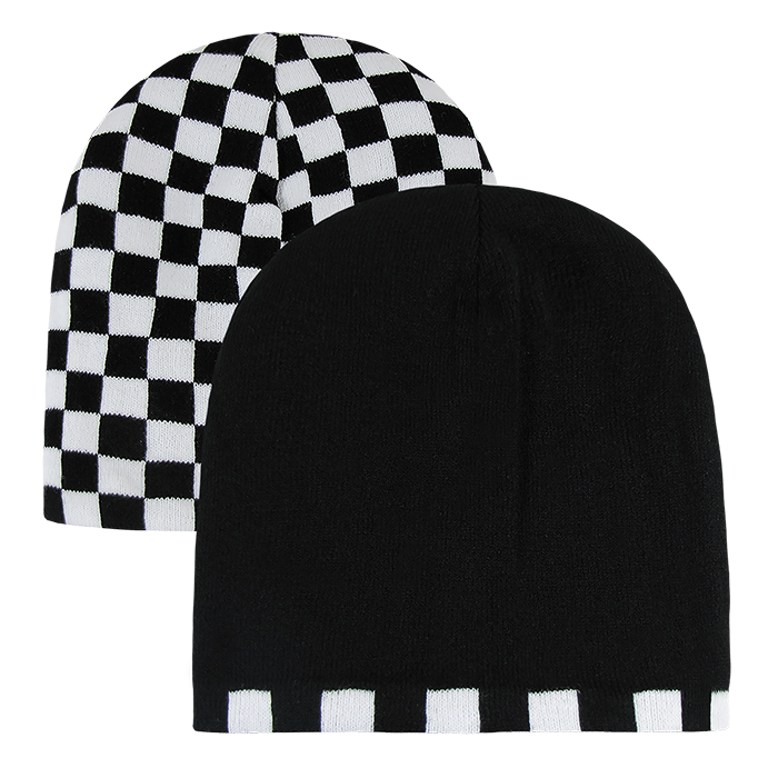 The Checker Knit Beanie (Decky 8024) is a short, snug-fitting, double-sided beanie. It features a solid color and checkered trim on one side and a fully checkered pattern on the other.