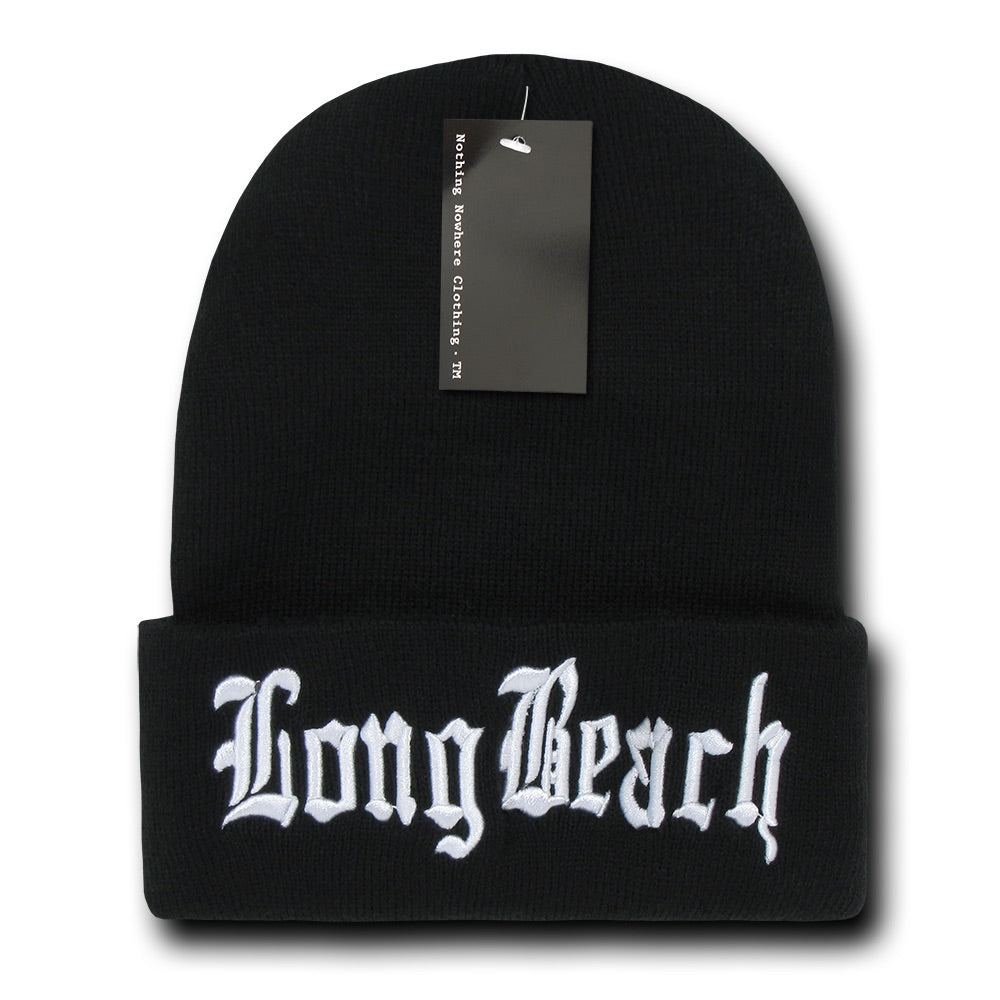 The Long Beach City Beanie is a warm, super-soft beanie knit cap featuring high quality embroidery in old english font to represent your city. This is a long, cuffed beanie and is perfect for winter weather or everyday use.