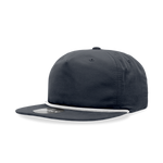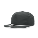 The Decky 6032 - Classic Rope Cap, 5 Panel Flat Bill Hat, Snapback is an unconstructed 5 panel cap. It features a flip-up buckram, braid at the base of the crown, and a retro flat bill style. The cap has an integrated cotton sweatband, ventilation eyelets, and is finished with a plastic snap closure for a perfect fit.