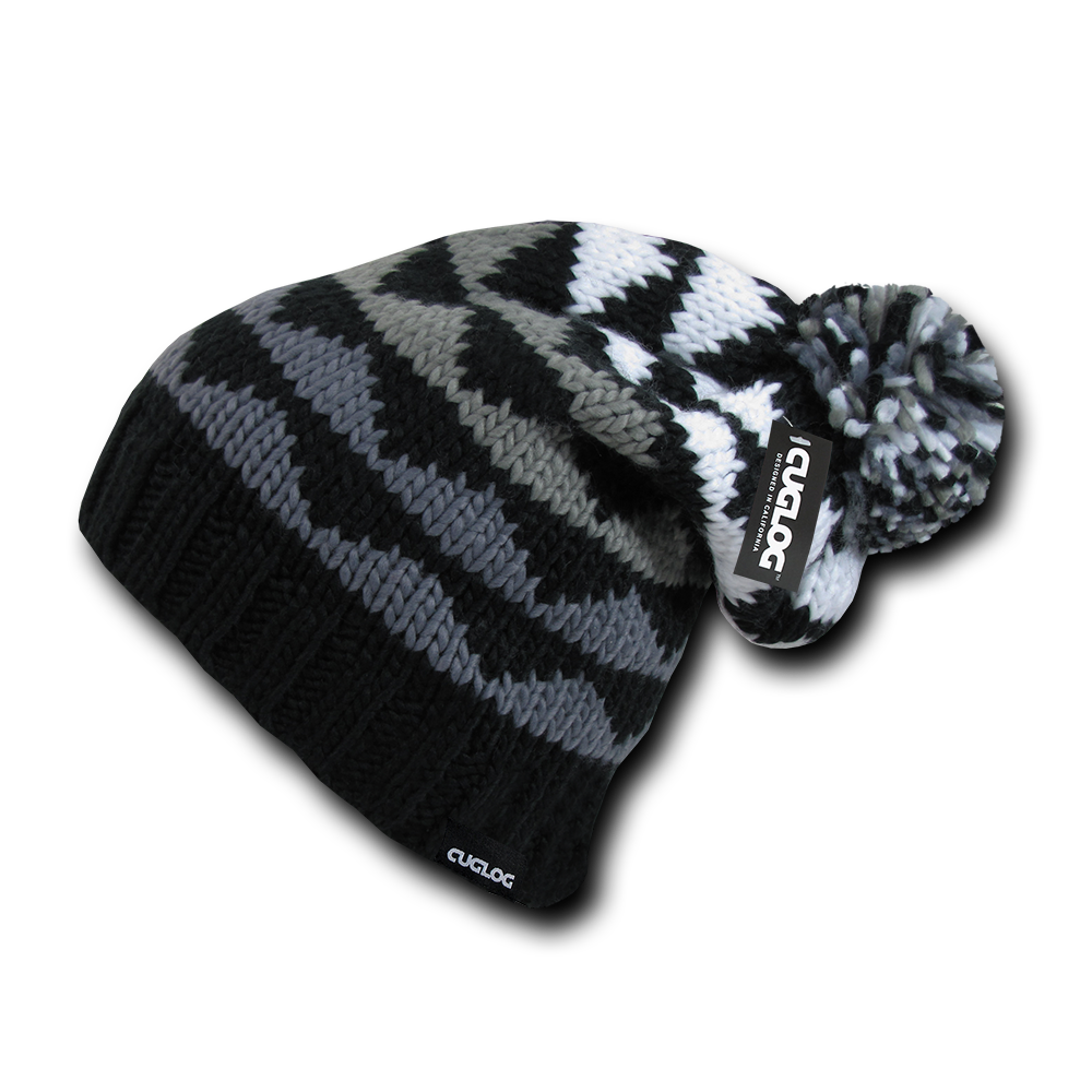 The K2 Beanie, Knit Cap, Cuff Slouch Beanie with Pom Pom (Cuglog K023) is a long beanie featuring a pom pom at the top and 3 colors design, This is a loose fitting beanie and is meant to be worn with a slouch.