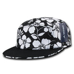 The 5-Panel Floral Tropical Racer Racing Jockey Hat Camper Cap Solid Bill (Decky 1070) is a lightweight, 5-panel cap featuring a fashionable, black and white floral print on the crown and a black retro flat bill. It's finished off with an integrated sweatband and adjustable plastic press-type closure.