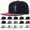 The Lot of 12 Decky Bandana Bill Paisley Snapback Hats Flat Bill Caps Bulk is a 6-panel structured cap featuring a colorful and unique paisley design on the bill. Comes with an integrated cotton sweatband, stitching across the bill and six top ventilation eyelets. The cap sports a retro flat bill and a plastic snapback closure.